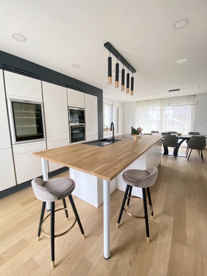 Die moderne Einbauküche beeindruckt nicht nur durch ihre Funktionalität, sondern auch durch eine Kochinsel und einen integrierten Weinkühlschrank, die das Kocherlebnis auf ein neues Level heben.