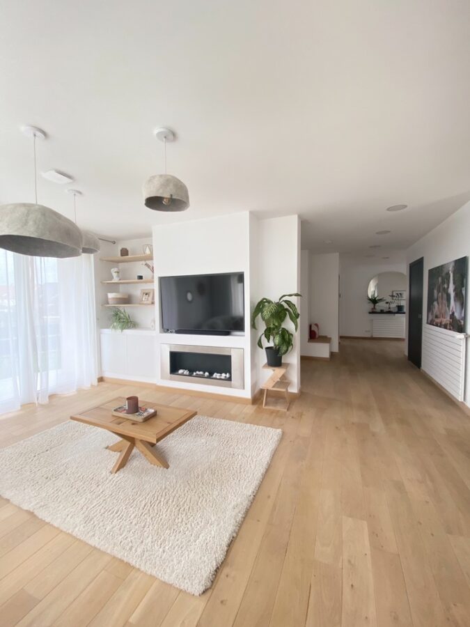 Im Erdgeschoss erwartet Sie ein großzügiger offener Bereich von rund 80m², der Wohnen, Essen und Kochen verbindet. Durch das offene Raumkonzept verschmelzen der Eingang, das Wohnzimmer und die Küche nahtlos miteinander. Die beeindruckenden Volumina und die außergewöhnliche Helligkeit prägen diesen Raum. Parkettböden und ein behaglicher Kamin verleihen dem Ambiente Wärme und Gemütlichkeit.