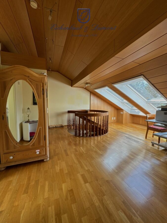 Die Maisonettewohnung im OG und DG des Hauses, verbunden durch eine Wendeltreppe im Wohnbereich, aber auch erreichbar jeweils über das Treppenhaus, ist im Rahmen des Baujahrs hochwertig ausgestattet, ebenfalls bereits mit Fußbodenheizung und elektrischen Rollläden und teilt sich auf in die Wohnebene mit Terrasse im OG (mit dem Garten über eine Wendeltreppe erreichbar) und dem Schlafbereich im DG.