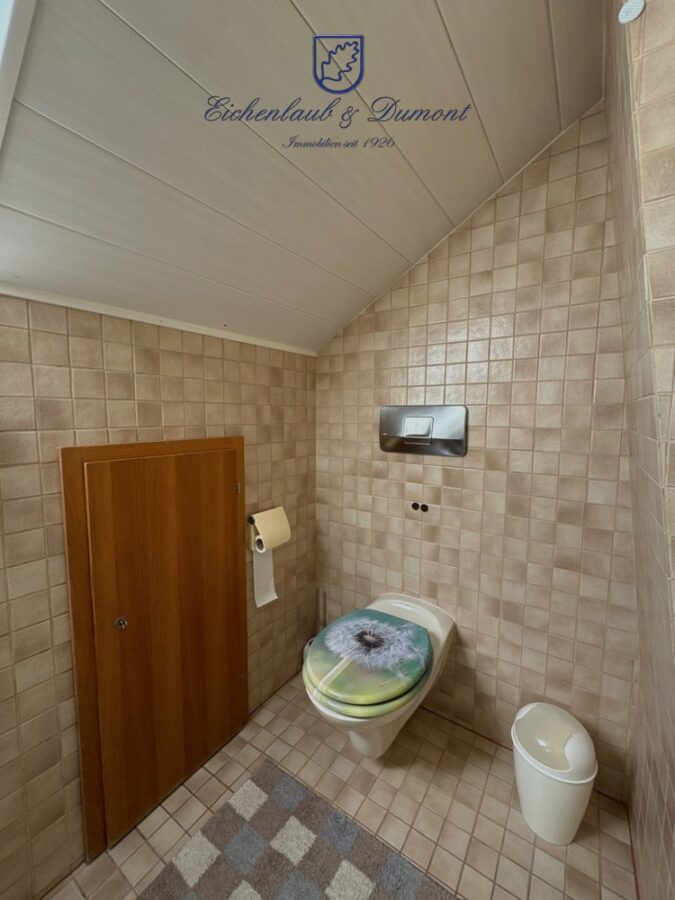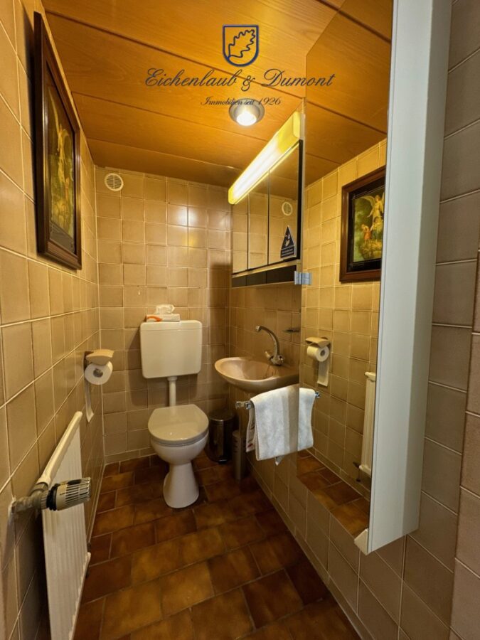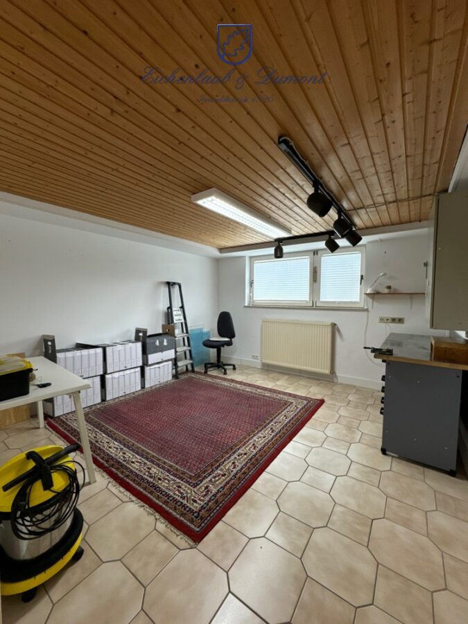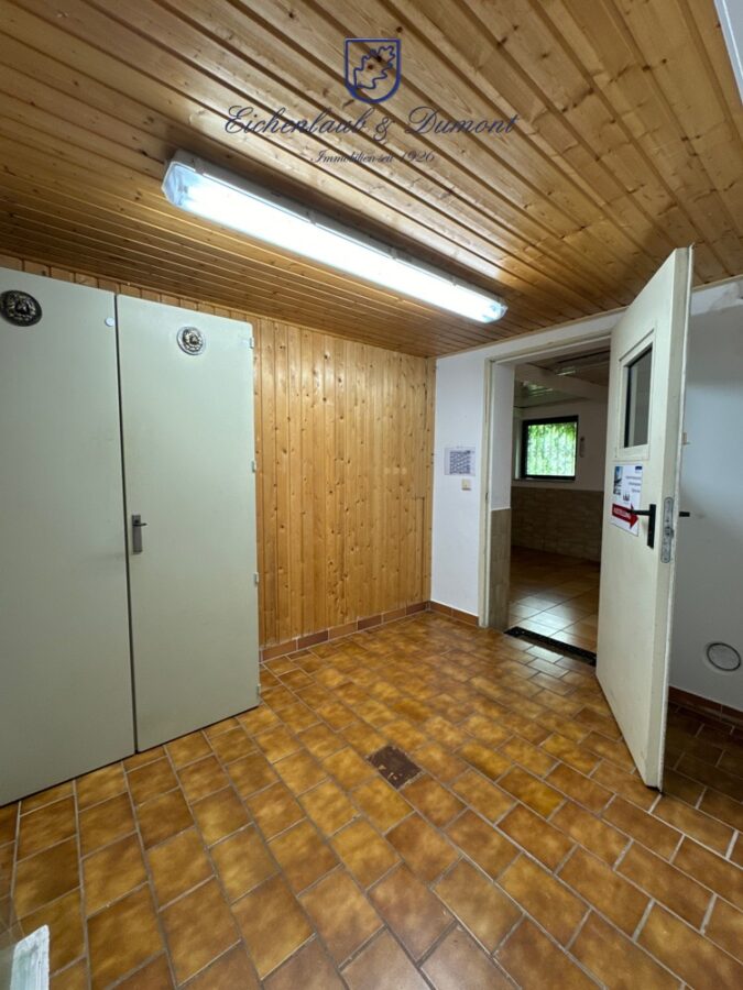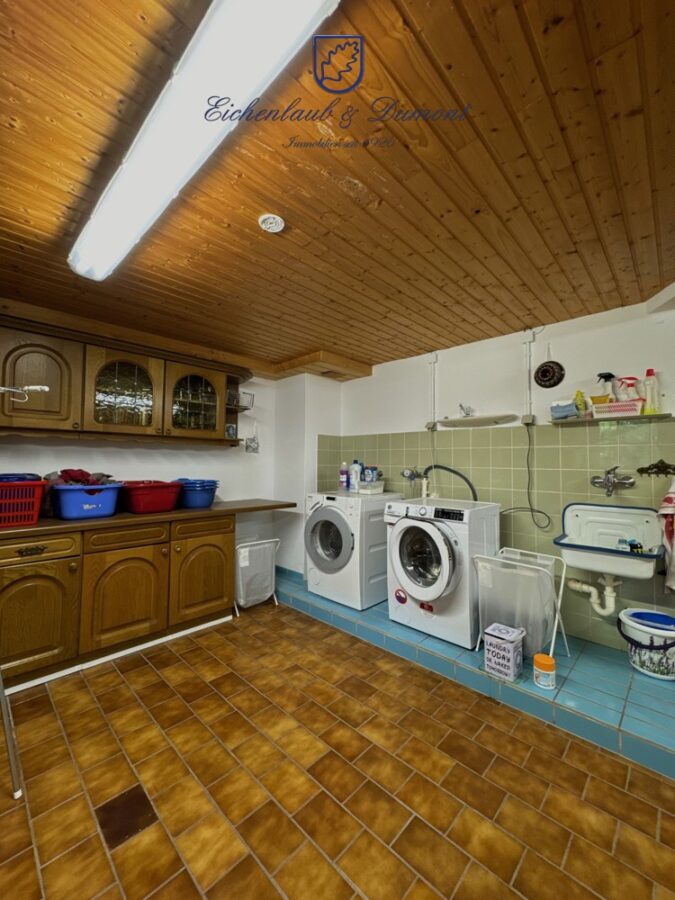 Der komplett geflieste, saubere Keller, verfügt über einen 20m² großen Gästeraum, gegenüber ein WC und weitere Räume mit Heizung und Waschküche.