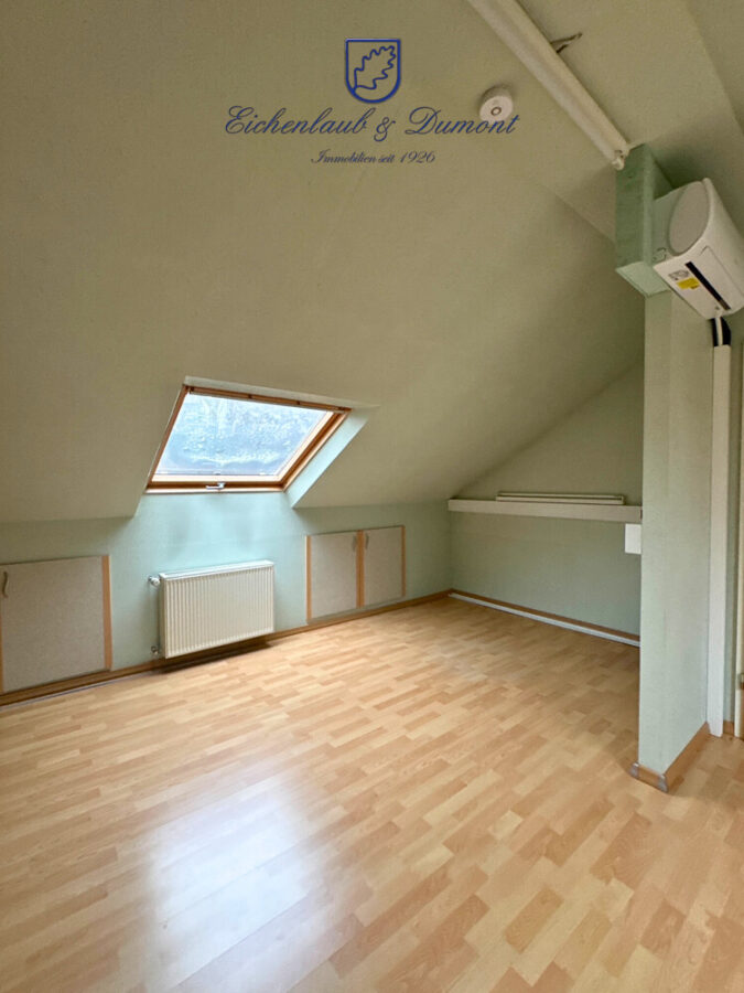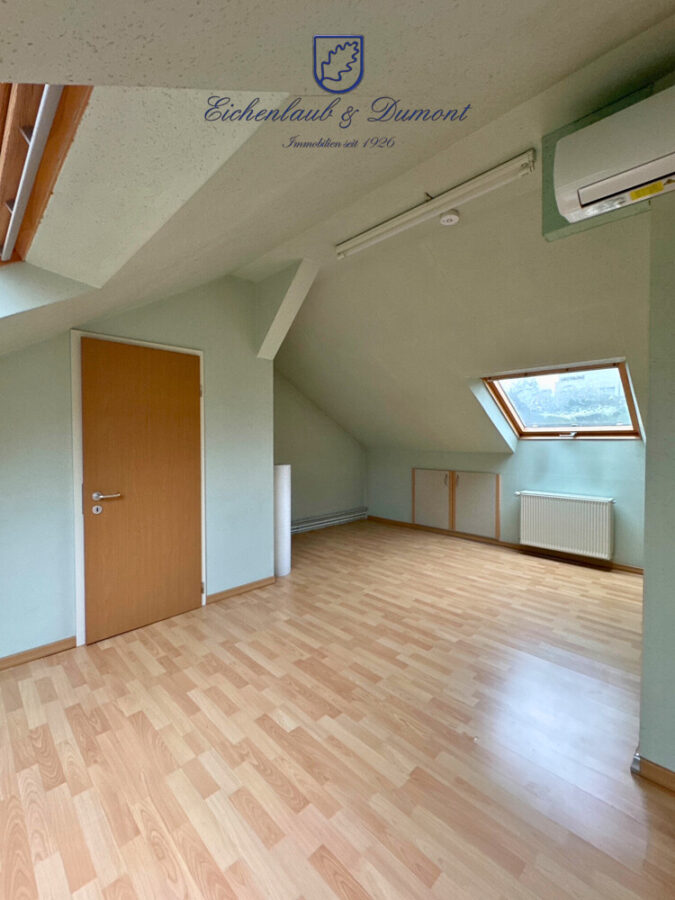 Eines der Schlafzimmer dient quasi als Durchgangszimmer zum Balkon. Über diesen gelangt man über eine Treppe, also einen außenliegenden Zugang, in das nachträglich als Hobbyraum bzw. Home-Office ausgebaute Dachgeschoss, wo sich auch die moderne Gastherme befindet und ein weiteres WC. Auch dieser Raum ist zusätzlich klimatisiert.