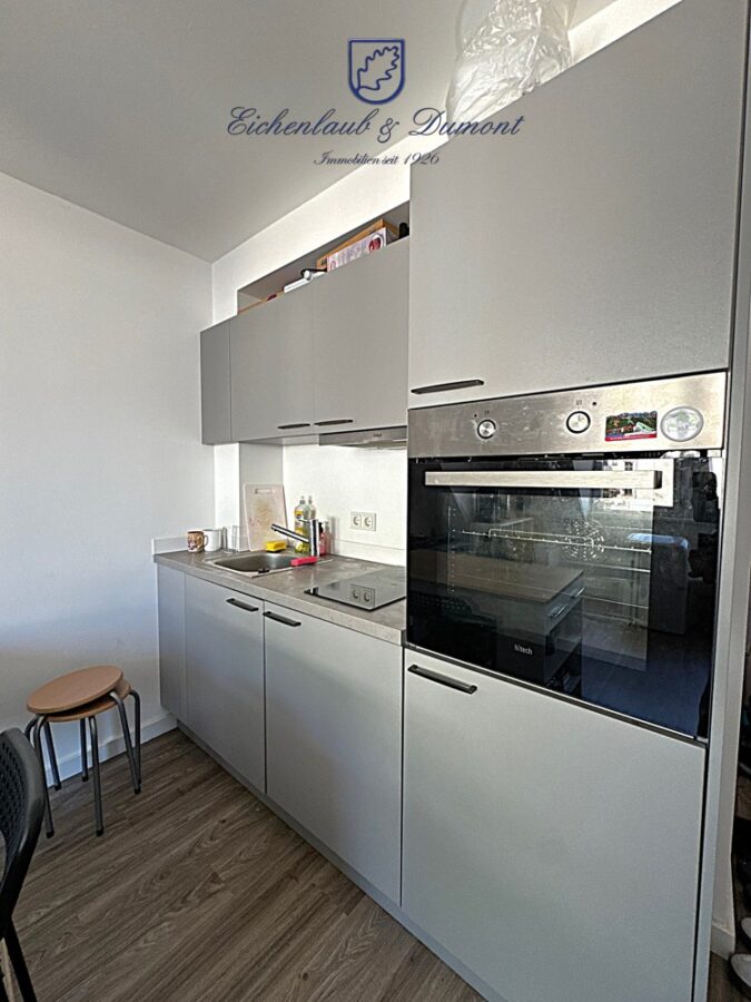 Die Wohnung verfügt über eine Diele, die beide Zimmer miteinander verbindet. Das erste Zimmer ist als Wohn- und Essbereich gestaltet und mit einer modernen Einbauküche inklusive Elektrogeräten ausgestattet. Über einen offenen Durchgang in der Diele gelangt man in das Schlafzimmer, an das ein Badezimmer angrenzt.