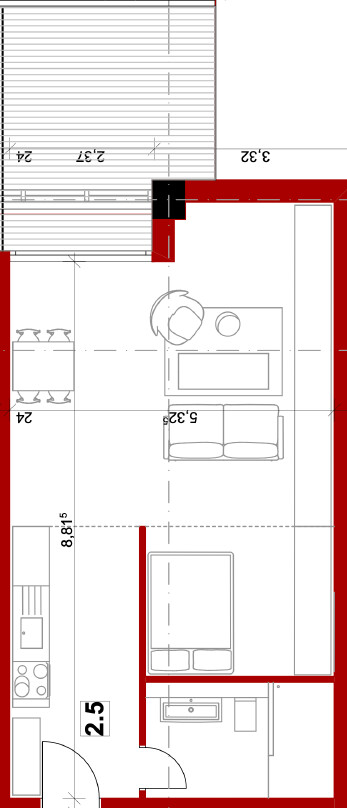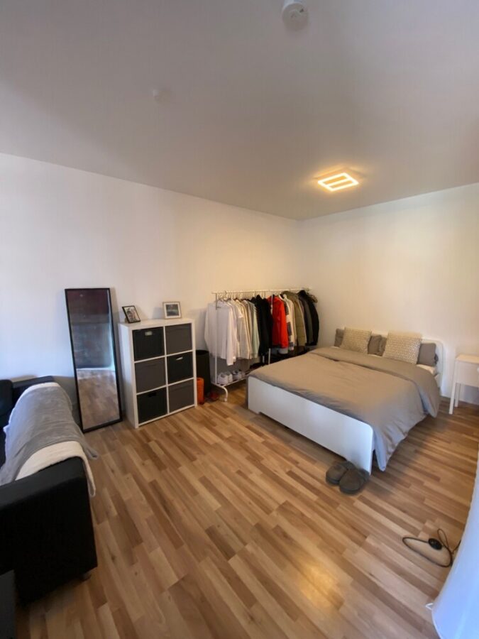 Anschließend daran befindet sich der Schlafbereich praktisch in einer Nische des Raums, gegenüber des Wohnbereichs.