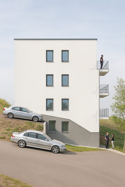Vor dem Gebäude befinden sich optional erwerbbare (Außen-) Stellplätze (12.000 € Kaufpreis).