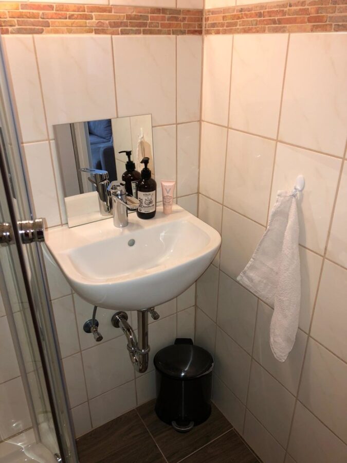 Nach Betreten der Wohnung befindet sich auf dieser Ebene die Diele, das innenliegende Duschbad mit Rainshower-Dusche und Handtuchheizkörper, der Wohn- und Essbereich mit Ausgang zur Loggia und dem Treppenaufgang zur oberen Ebene und die kleine Einbauküche.